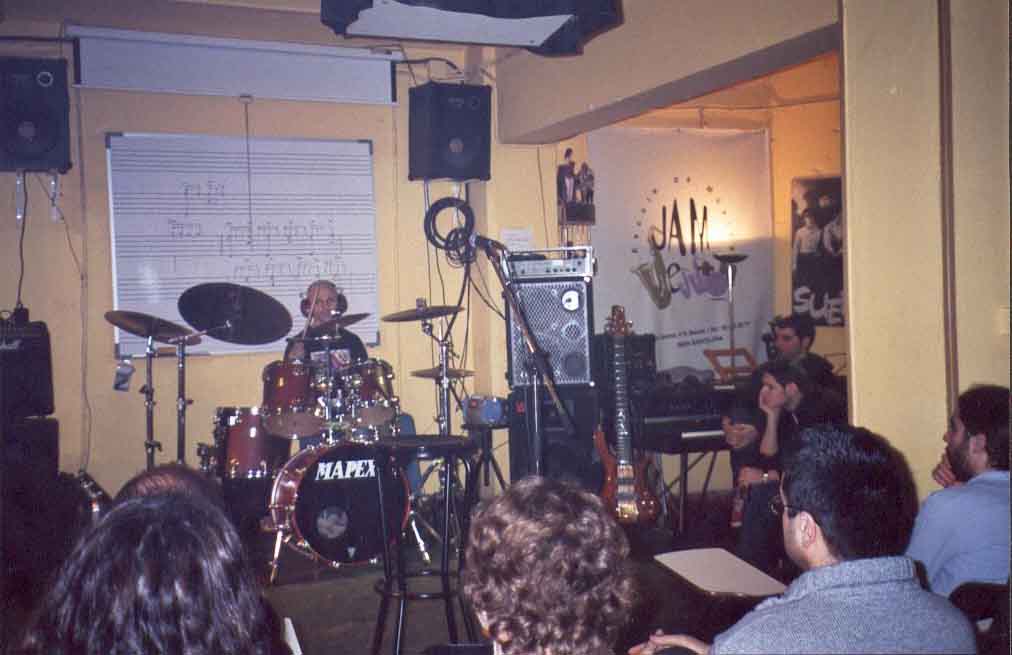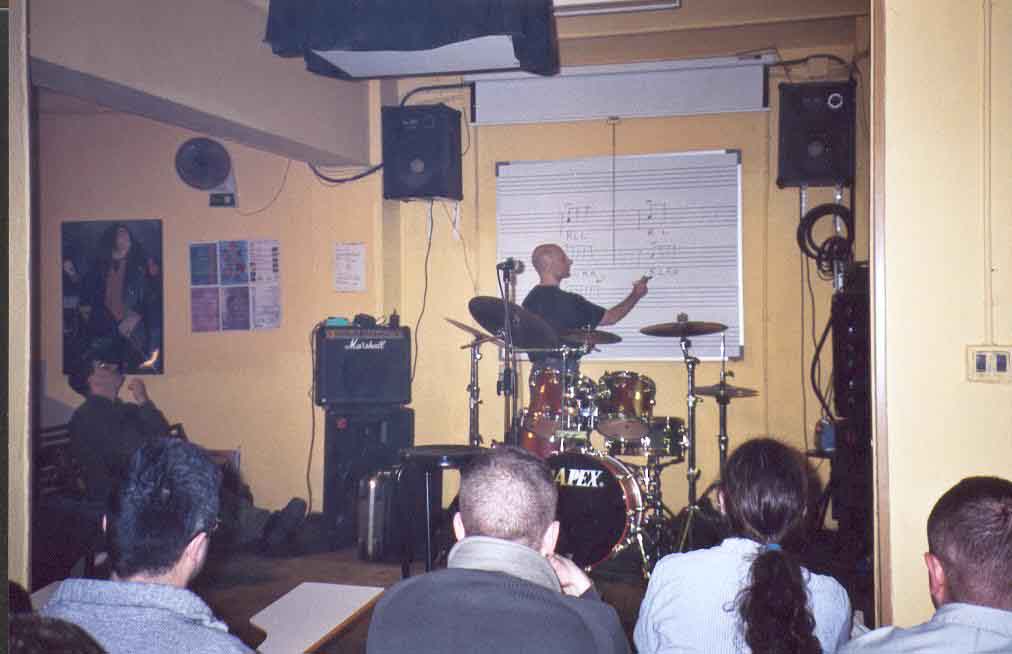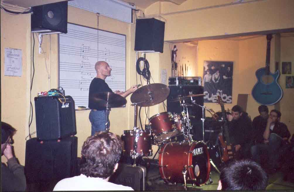 Algo que cabe destacar, es la excelente labor pedagógica que ofreció en nuestro clínic, escribiendo en la pizarra todos los ritmos que tocaba. Ángel es uno de los especialistas en éste país de la técnica "Linear Phrasing", combinando diferentes grupos de notas con diferentes combinaciones de manos. Fue toda una atracción de técnica y desafío de la coordinación. Menos mal que nuestros profesores tomaron apuntes...porque lo que sois vosotros... no vinisteis ni con papel ni lápiz. ¡Vaya imagen le dimos a Ángel...! |