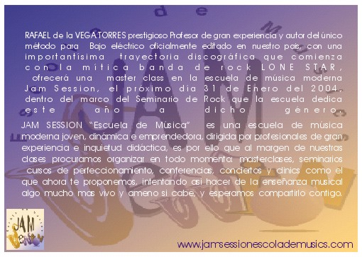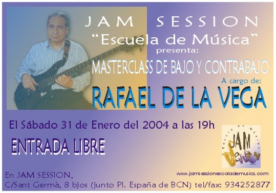 El pasado 31 de Enero, se celebró en la escuela de Música moderna Jam Session de Barcelona, la conferencia y clinic sobre la historia del bajo, " De Haydn a Pastorius ", de la mano del profesor de bajo de dicha escuela Carlos Duke, y como invitado el veterano Rafael de la Vega al contrabajo. Dos especialistas que desgranaron los orígenes de éstos dos instrumentos, que aunque comparten muchas cosas en común, tienen su propia personalidad, y sufren su evolución a través del tiempo.