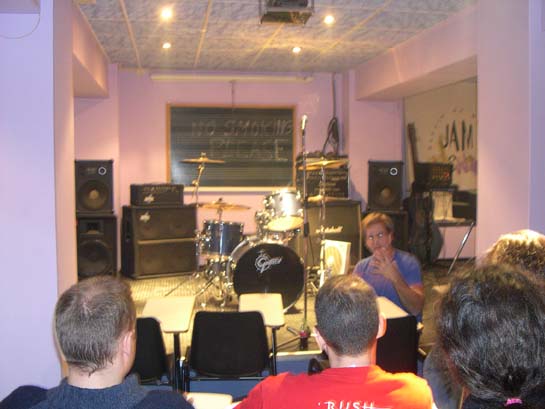 Eran las 12:30 de la mañana de un sábado, cuando todavía convalecientes del clinic de Richie Kotzen, que habíamos celebrado el anterior dia por la tarde, entró en el auditorio de nuestra escuela Jam Session, un descansado y simpático Pat Torpey, que sin poner ningún impedimento ni exigencia, comenzó a preparar la Gretsch que teníamos en la sala. Entre los cafés de la mañana, el auditorio mostraba un aforo medio, con mucha menos espectación que su compañero Richie Kotzen, pero con un público profesional, más interesado en el estudio del instrumento, que en los éxitos comerciales. Pat solo se trajo su pedal, ya que aquí, reside uno de sus secretos profesionales.